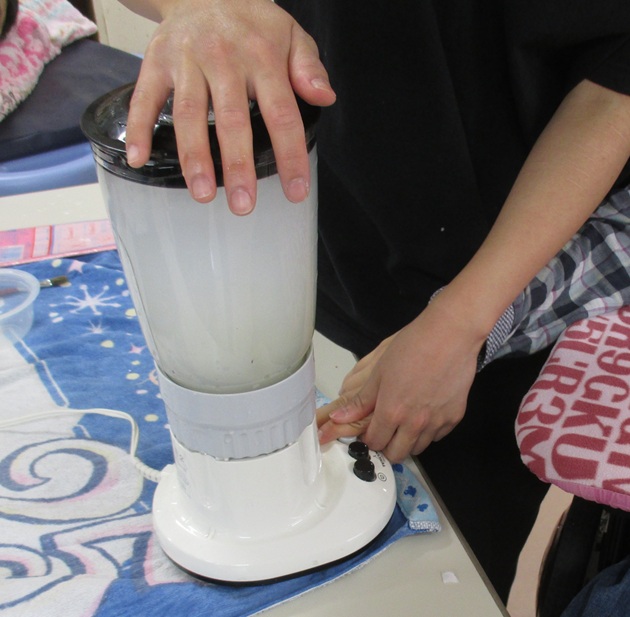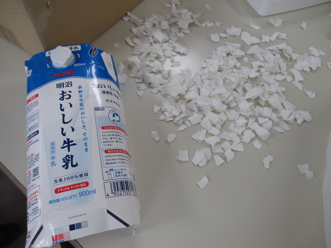 牛乳パックのフィルムをはがしてパルプを取り出し、粉々にちぎったものを