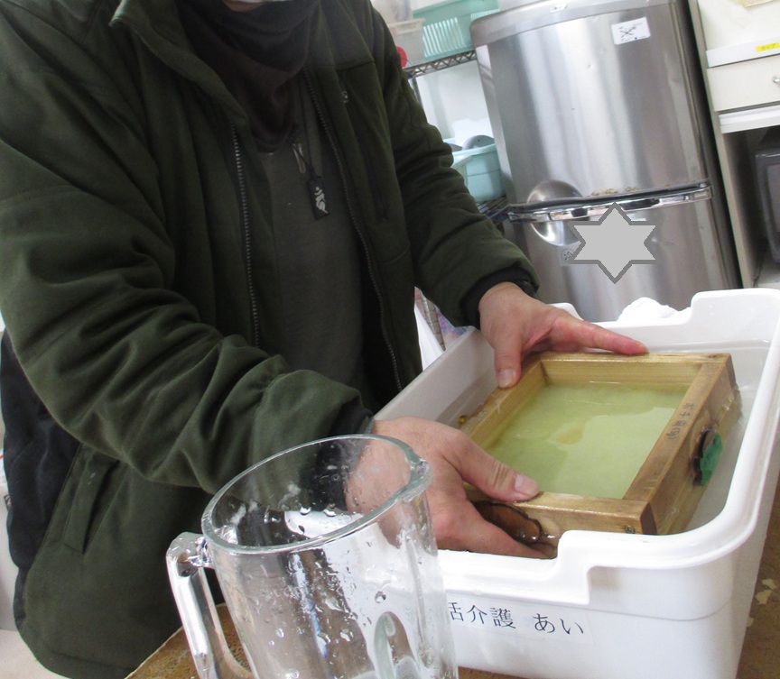 色付けをした液体を紙すきしてから、乾かし、便箋と封筒に形を整えます。
